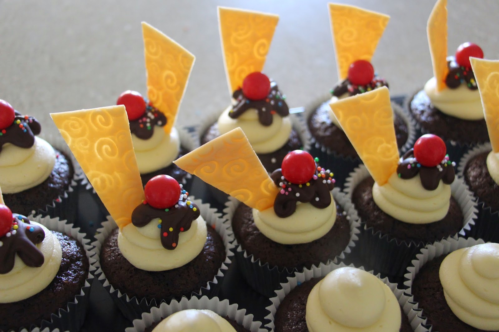 I was asked to make some cupcakes for a friend to take to school for her daughter's birthday today. There was no theme she had in mind, just 'chocolate' for the flavour. Baffled with ideas, I eventually chose a design I have wanted to try and make for ages... The cupcake sundae.